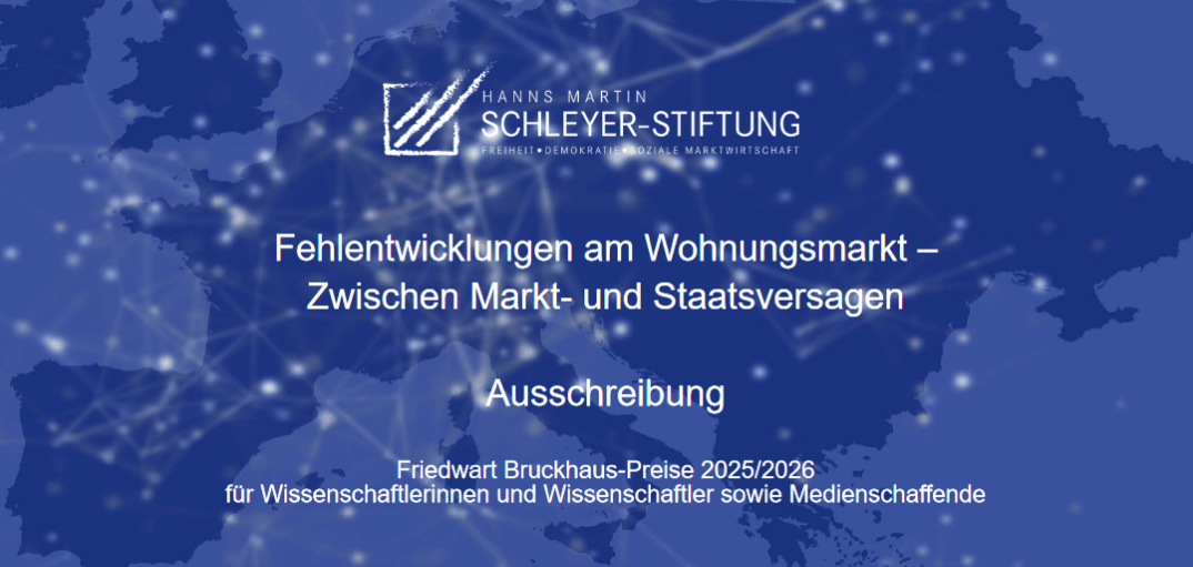 Der deutsche Wohnungsmarkt steht erheblich unter Druck: Für 2026 wird ein Rückgang der Neubautätigkeit um rund 15 Prozent erwartet, während sich die negative Entwicklung entgegen dem europäischen Trend fortsetzt. Mangel an Wohnraum in den Städten, steigende Mieten, hohe bürokratische Hürden sowie zusätzliche Anforderungen an Energieeffizienz, Nachhaltigkeit und soziale Aspekte verschärfen die Lage, verstärkt durch den demografischen Wandel. Gesucht werden wissenschaftliche und journalistische Arbeiten, die Ursachen dieser Fehlentwicklungen analysieren und praxisnahe Lösungsansätze entwickeln: Wie kann Politik regulierend eingreifen, ohne den Markt zu lähmen, und welche neuen Technologien und Wohnkonzepte können den Wohnungsmarkt langfristig zukunftsfähig machen und Markt- wie Staatsversagen überwinden? Teilnehmen können Wissenschaftlerinnen und Wissenschaftler sowie Medienschaffende, deren Arbeiten seit dem 1. Januar 2024 in deutscher oder englischer Sprache veröffentlicht wurden und die zum Bewerbungsschluss das 40. Lebensjahr noch nicht vollendet haben. Weitere Informationen gibt es hier.